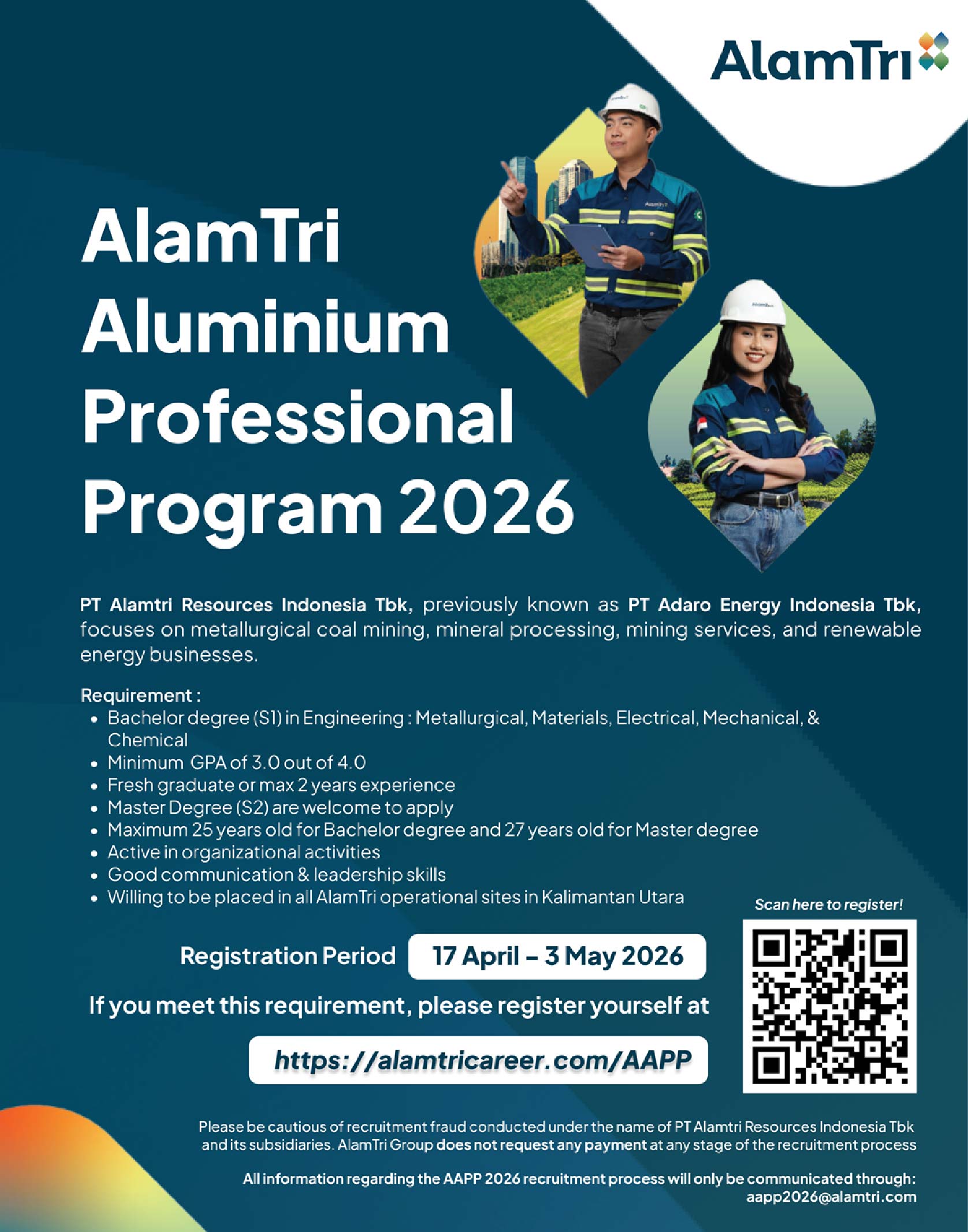 • Please be cautious of recruitment fraud conducted under the name of PT AlamTri Resources Indonesia Tbk and its subsidiaries. AlamTri Group does not request any payment at any stage of the recruitment process.