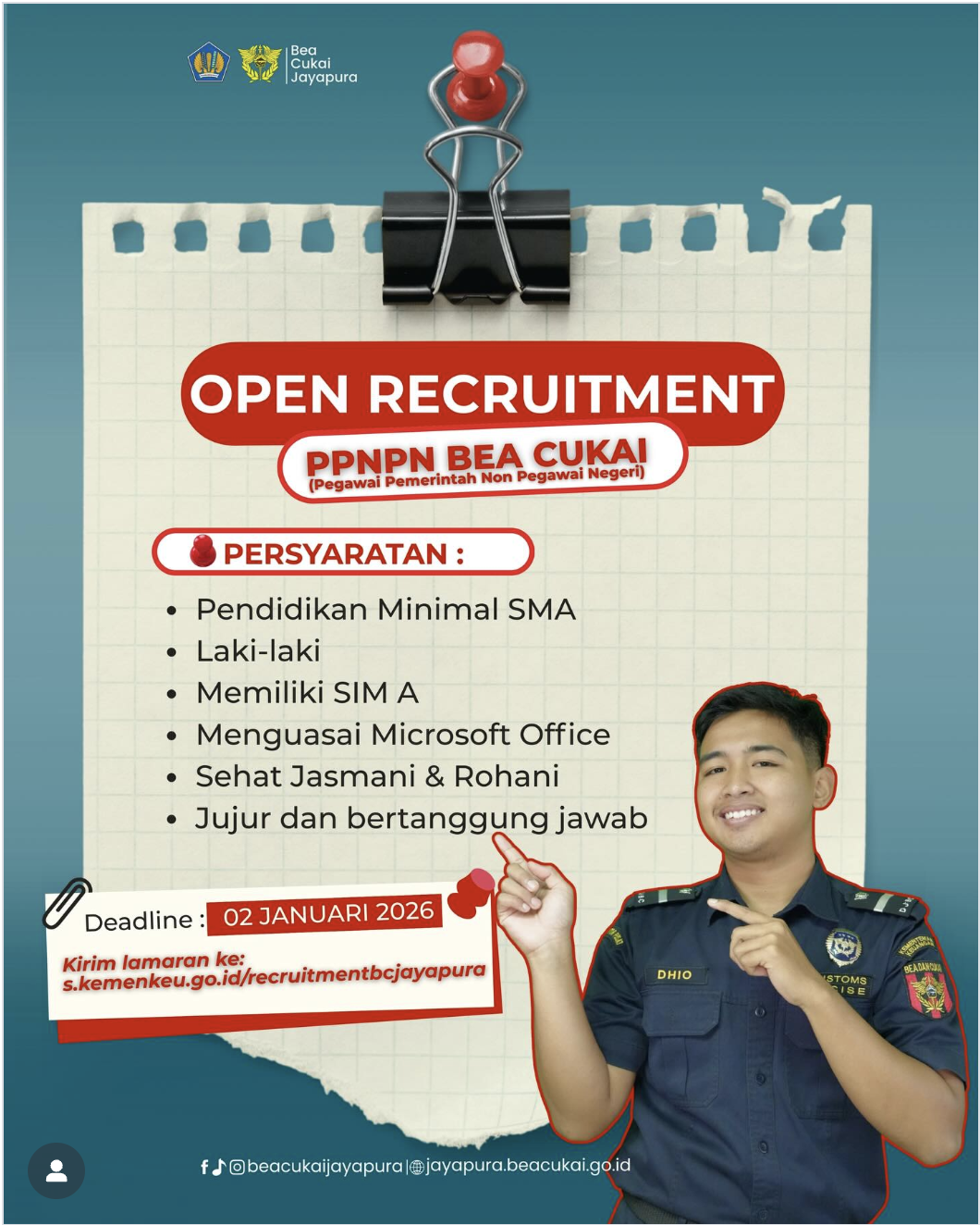 Dalam rangka pemenuhan SDM pegawai kantor Bea Cukai Jayapura, Kami umumkan lowongan kerja dengan posisi sebagai PPNPN (Pegawai Pemerintah Non Pegawai Negeri) dengan spesifikasi tugas sebagai driver, administrator, dan protokoler. Adapun detail tugas selebihnya akan dijelaskan lebih lanjut dalam sesi tatap muka.