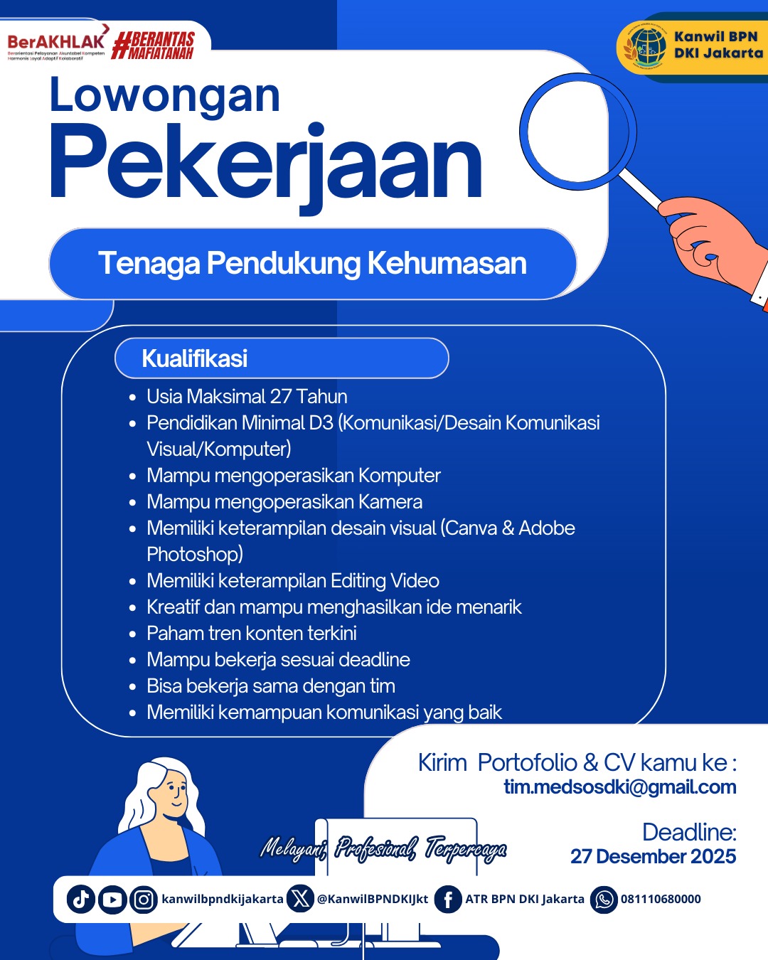 • Pendidikan minimal D3 (Komunikasi/Desain Komunikasi Visual/Komputer)