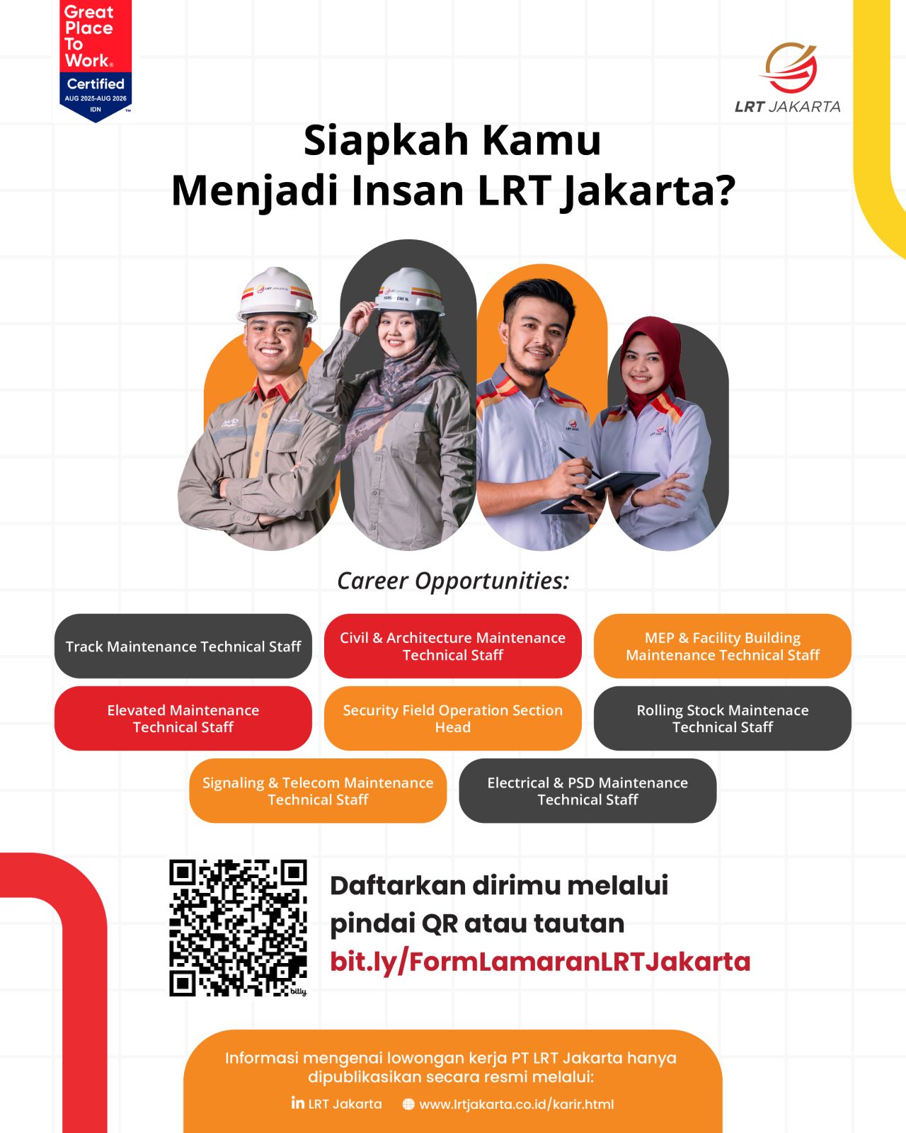 Saat ini PT Light Rail Transit Jakarta (LRT Jakarta) memberikan kesempatan lowongan kerja untuk dapat bergabung bersama dengan posisi sebagai berikut: