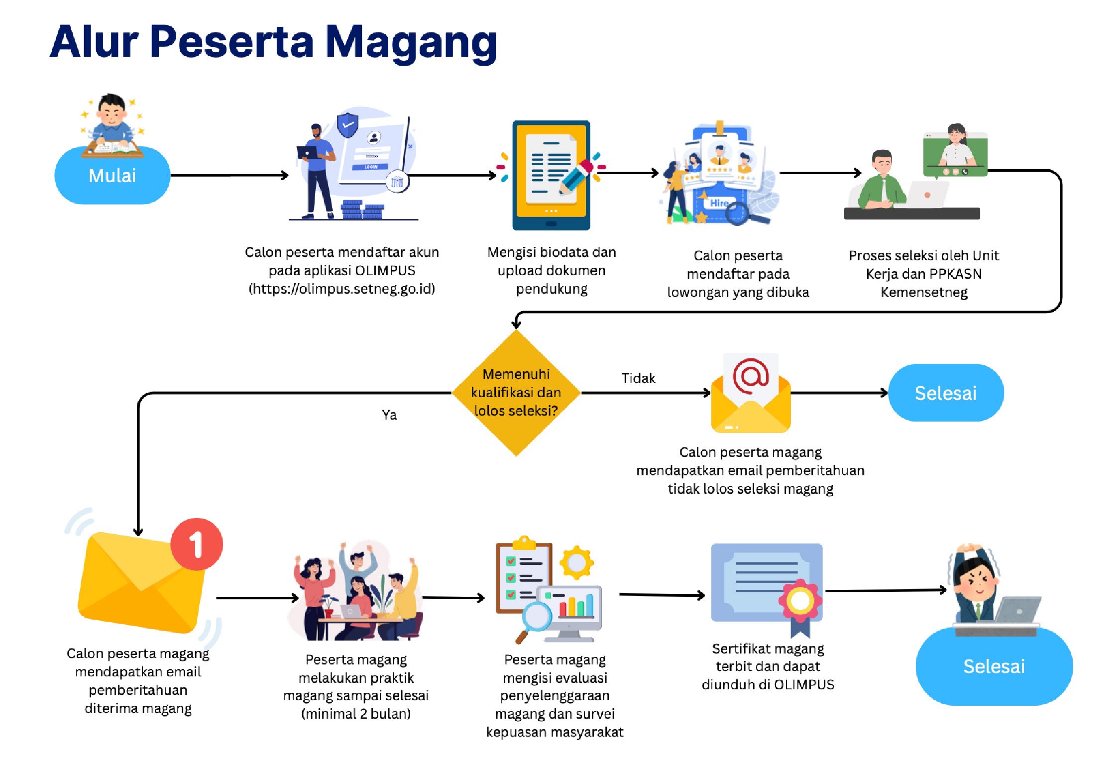- Pengumuman hasil seleksi magang melalui aplikasi : https/olimpus.setneg.go.id tanggal 26 s.d. 31 Desember 2025.